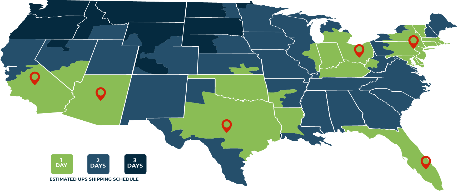 We can reach any address across the US in an estimated 1-3 days via UPS Ground.